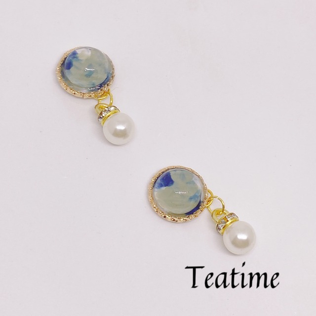 マーブル模様のカボションアクセサリー 魔法の鏡のような不思議カラー ピアス、イヤリング、マグネットピアスより選択可 ブルー