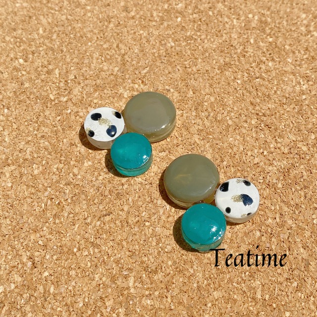 人気のクッキー&クリーム柄を取り入れた3連のアクセサリー。差し色として入れられたカラーはグリーンまたはスカイブルーの2色。お好きな方をお選びください。ピアスかイヤリングでのご希望を承ります。