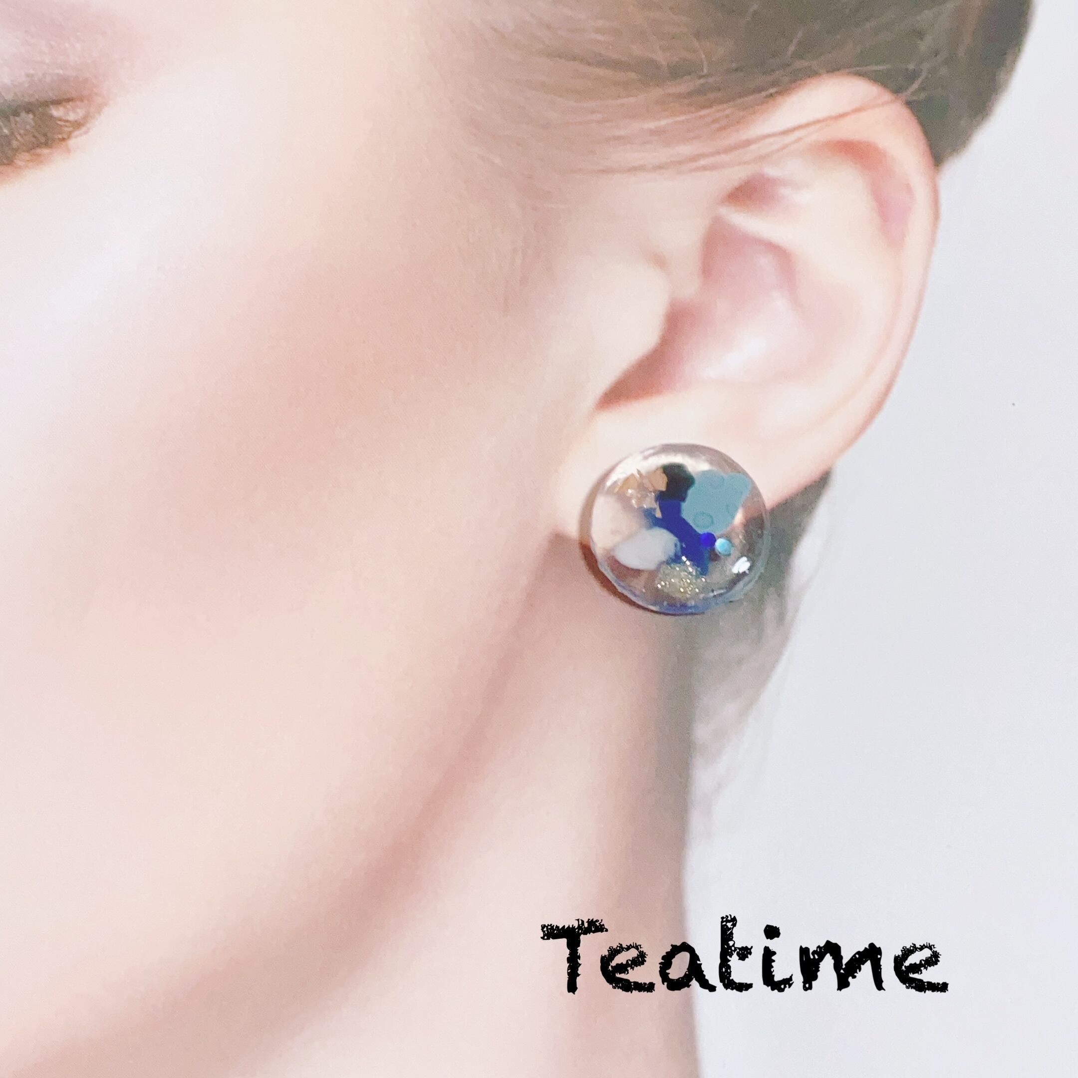 涼しげなクリアカラーの中に、まるで色遊びをしたようなデザイン。全4色でこちらは青となっております。 ピアス、イヤリング、マグネットピアスよりお選びいただけます。