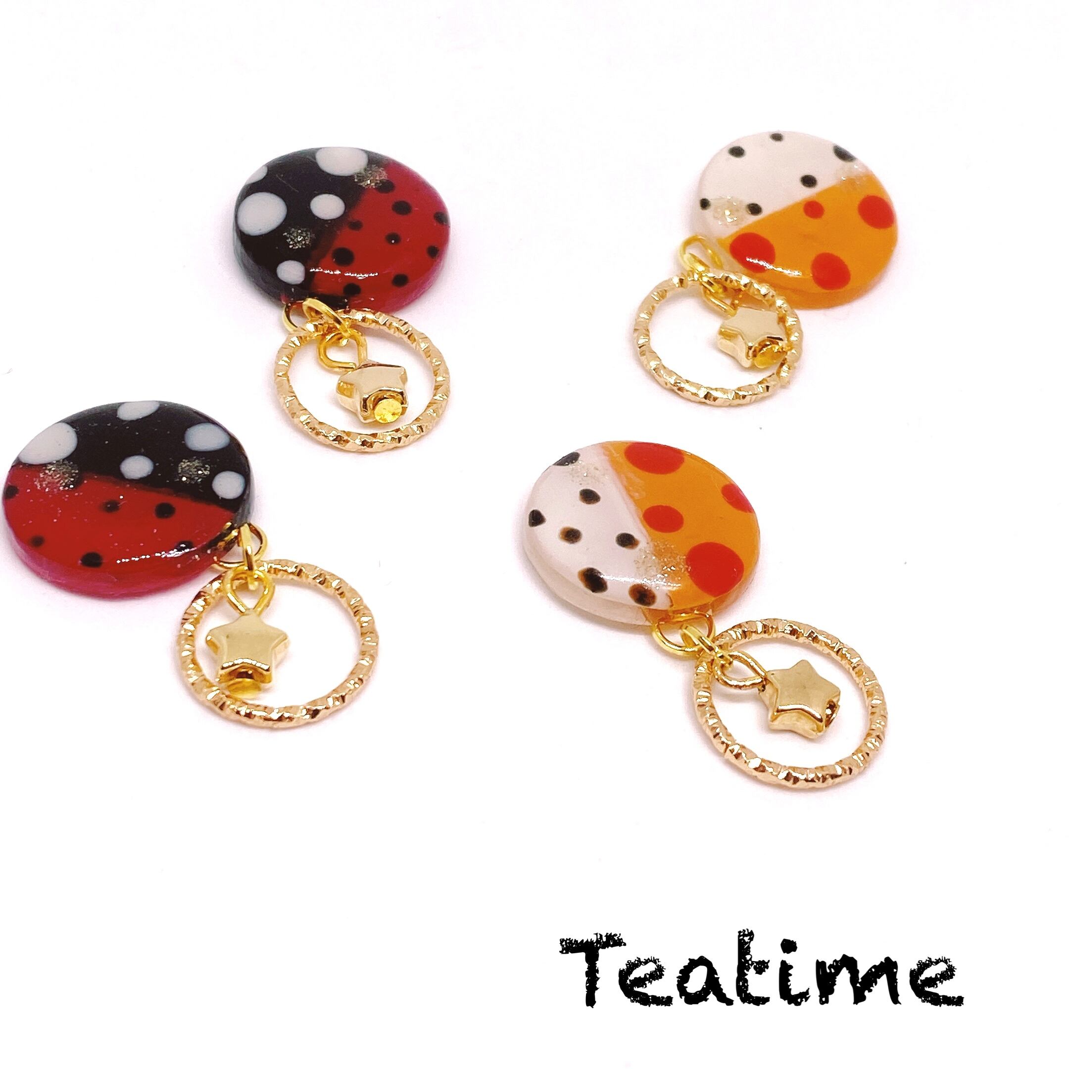 レジンで作ったパーツに1つ1つ手書きでドット柄を描きました。馴染みのあるドット柄だけど、新しい感覚のデザイン。下にはゴールドの星付き。